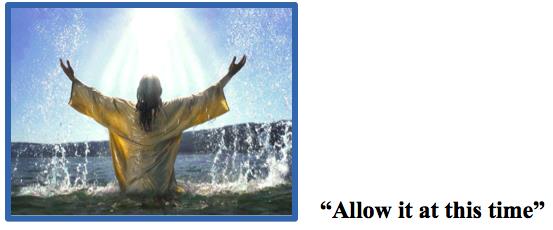 • Matthew 3:13-17Then Jesus arrived from Galilee at the Jordan, coming to John to be baptized by him. 14 But John tried to prevent Him, saying, “I have the need to be baptized by You, and yet You are coming to me?” 15 But Jesus, answering, said to him, “Allow it at this time; for in this way it is fitting for us to fulfill all righteousness.” Then he allowed Him. 16 After He was baptized, Jesus came up immediately from the water; and behold, the heavens were opened, and he saw the Spirit of God descending as a dove and settling/lighting [Abode – John 1:32] upon Him, 17 and behold, a voice from the heavens said, “This is My Son the beloved with whom I am well pleased.”