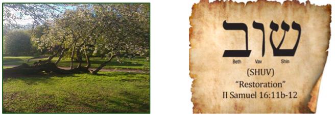 As He spoke the words of Everlasting and Compassion, He showed me three more scenes.  We were back at a fallen tree but there had been a change.  Rather than useless or dead, new life was springing from the tree.  There were eight [new beginning] small trees growing with new life.  He continued, “When My Children [men and women] believe their time has passed, I AM the new beginning and Restoration.  [SHUV, 2 Samuel 16:11-12 – God of Restoration]  The next scene was of the eight trees bursting with new blossoms.  Besides their beauty, you could smell a pleasing fragrance as they enjoyed the sun.  [Son]  The last scene was brief – a pair of wedding rings with a radiance around them.  Our private time was over, and I knew to study what had been shown and spoken.
