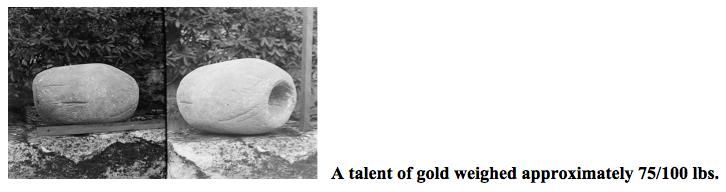 The Hebrew term for “talent” was kikkār, a flat, round gold or silver disk, or circular-shaped loaf.  In the Greek language, the word comes from tálanton, a large monetary measurement equal to 6,000 drachmas or denarii, the Greek and Roman silver coins.