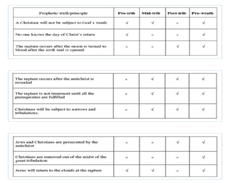 • Post-tribulation, mid-tribulation, pre-wrath tribulation, and pre-tribulation rapture.